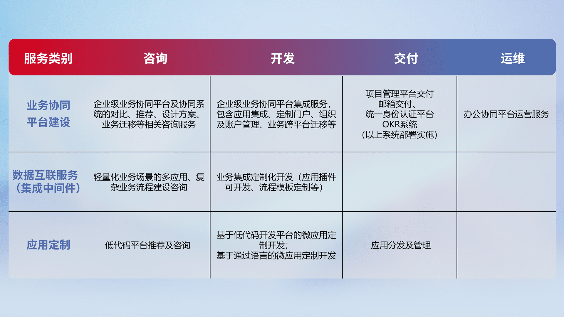 针对钉钉、、、企微、、IDaas等平台级产品提供产品的规划、、、、方案、、、、交付、、、定制化开发等服务,,,实现如统一协同办公、、、智能客户服务、、混合会议管理、、、智能数据查询、、、等业务场景,,,实现数字化转型。。。